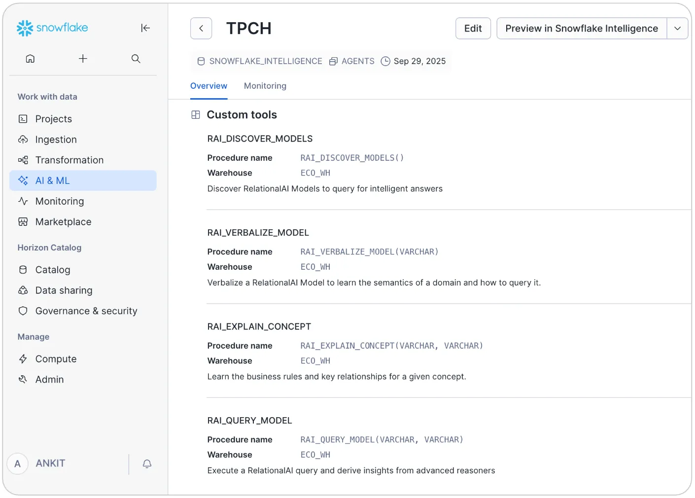 Register and Integrate: Define tool wrappers for the Cortex Agent and register the RelationalAI procedures as callable tools. Snowflake Intelligence’s agent framework supports a tool registry pattern, allowing stored procedures to act as dynamic reasoning modules.